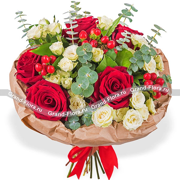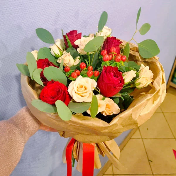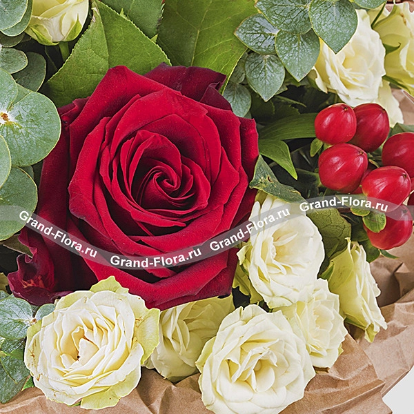 ЛЮКС: роза красная - 9 шт., роза кремовая кустовая - 4 шт., эвкалипт - 4 шт., гиперикум - 3 штт( Возможна замена на иные ягоды)., упаковка, лента. Примерный размер: 35Х35 см.