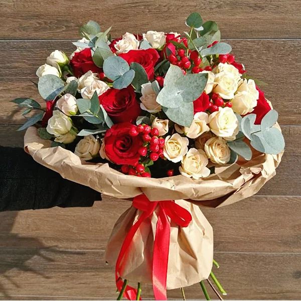ДЕЛЮКС: роза красная - 11 шт., роза кремовая кустовая - 10 шт., эвкалипт - 5 шт., гиперикум - 4 шт.т( Возможна замена на иные ягоды), упаковка, лента. Примерный размер: 45Х45 см.