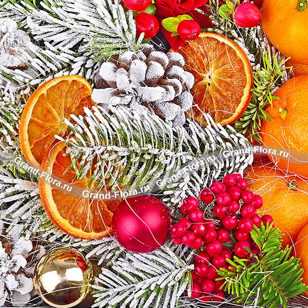 кустовые розы - 5шт., ель., гиперикум - 2 шт., шишки - 5 шт., елочные шарики - 8 шт., новогодний декор., мандарины - 1,5 кг., коробка.