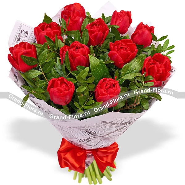 Душевный порыв - букет из красных тюльпанов с декоративной зеленью
