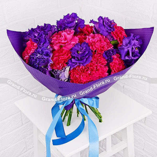 Люкс: гвоздика розовая - 13 шт., эустома синяя - 10 шт., упаковка, лента.