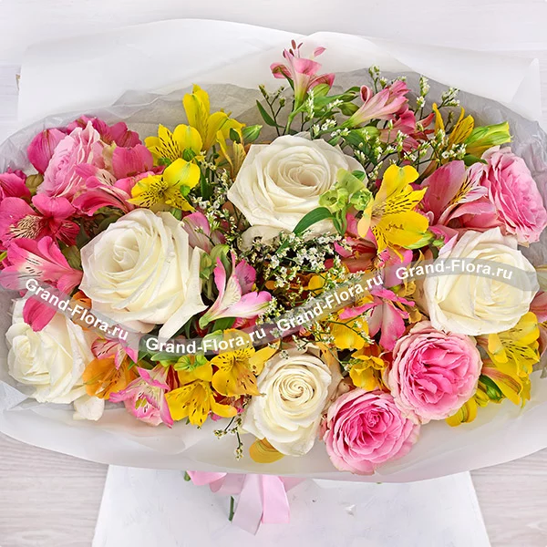 Роза белая – 2 шт., роза розовая – 2 шт., альстромерия желтая – 2 шт., альстромерия розовая –3 шт., лимониум белый– 2 шт., упаковка, лента.